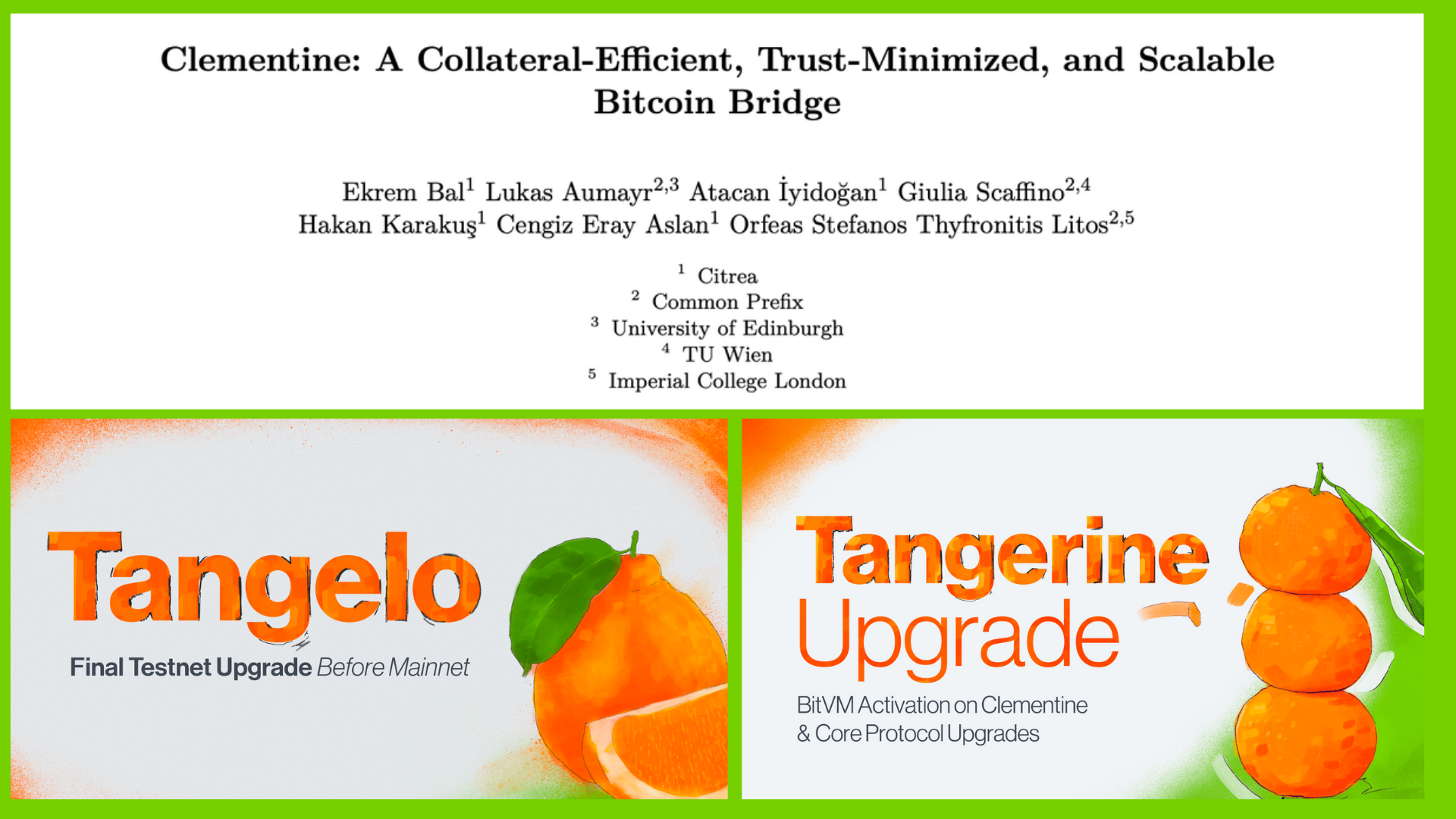- Tangerine Upgrade: This testnet upgrade brought significant improvements across proving performance, protocol security, account abstraction, and developer tooling. But most notably, Tangerine upgrade activated full BitVM support in Clementine. With this upgrade in place, we were able to test our bridge extensively. See the details of the Tangerine Upgrade.