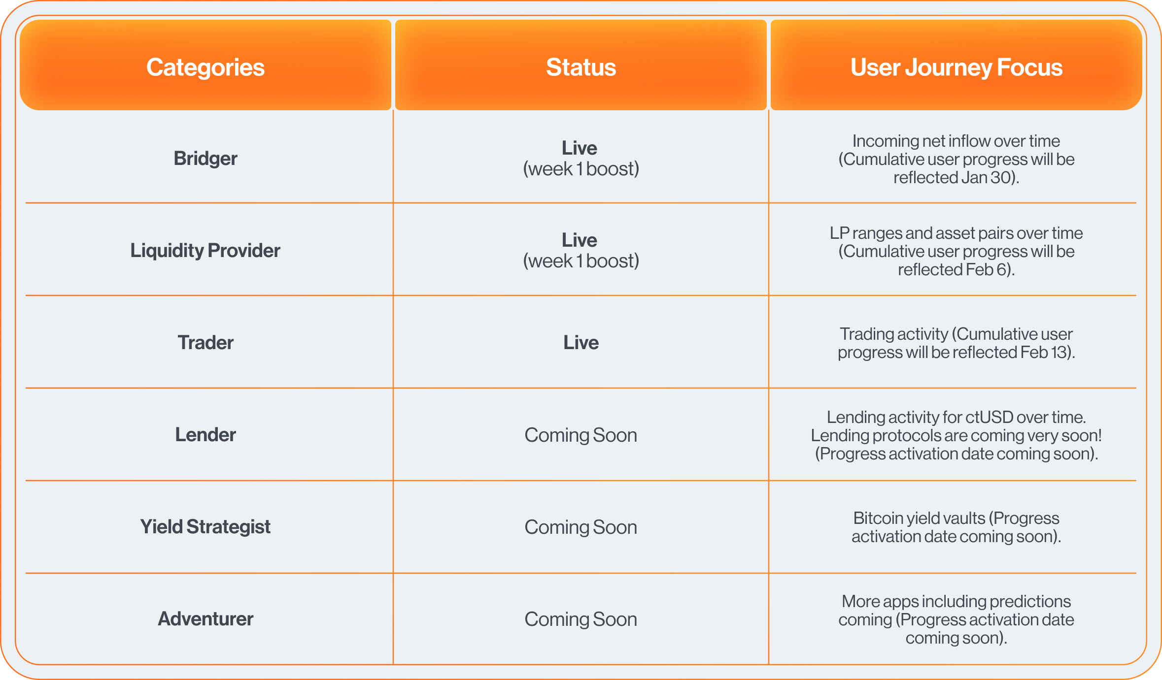 The dashboard shows user journeys in the following categories. From Day 1 of mainnet, activities in all live categories will count toward user progress, though that progress may not be first reflected until a later date: