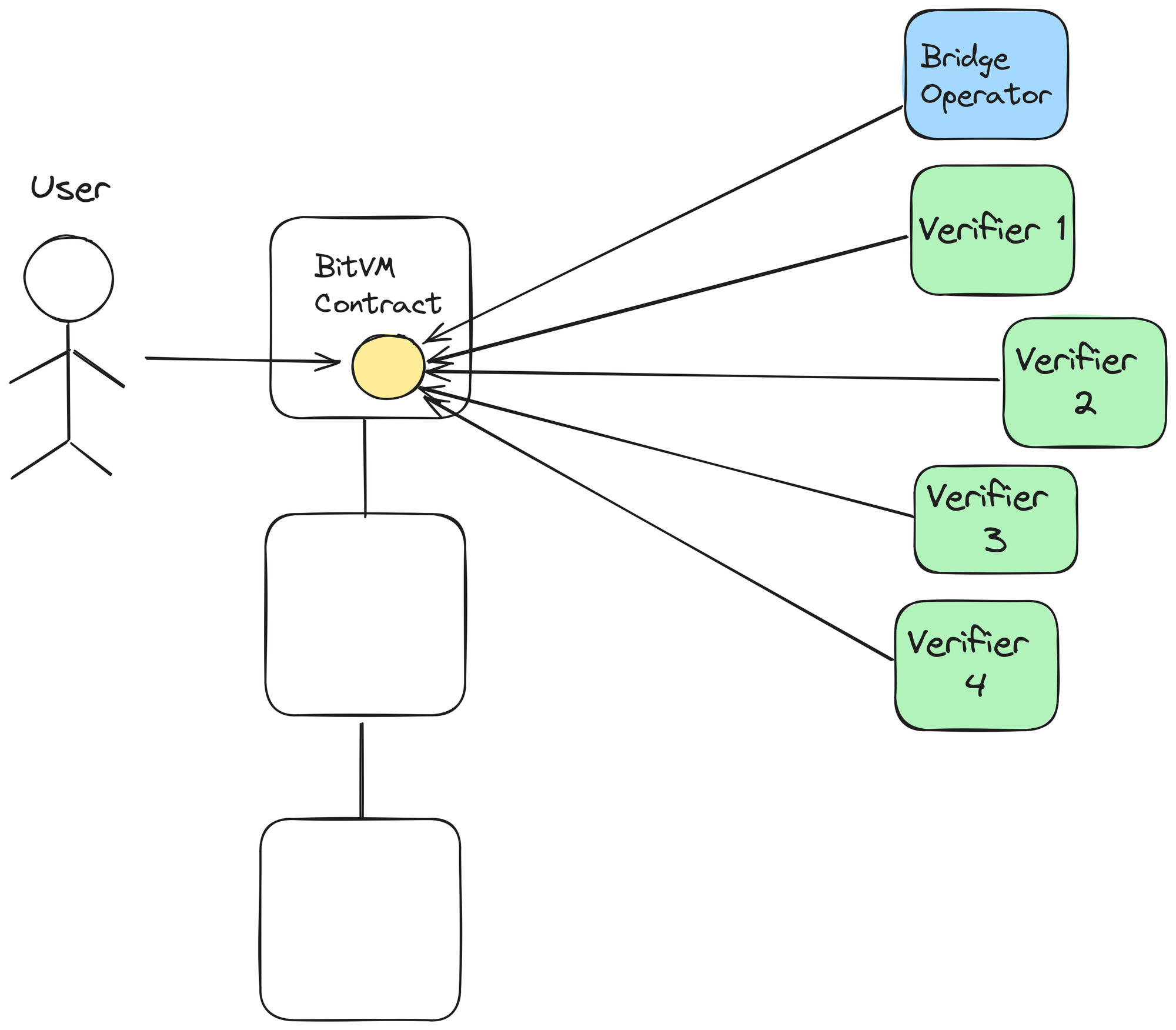 The peg-in process begins when a user sends BTC to the bridge operator. Verifiers, the actors empowered to challenge bridge operators, then sign the user’s transaction. This signature is submitted to the bridge operator, indicating the verifiers' approval of the BTC deposit. With this verification step complete, users can mint cBTC (citreaBTC) in exchange for the BTC sent to the BitVM controlled deposit address by sending the SPV (Simplified Payment Verification) of the transaction to a smart contract on Citrea.