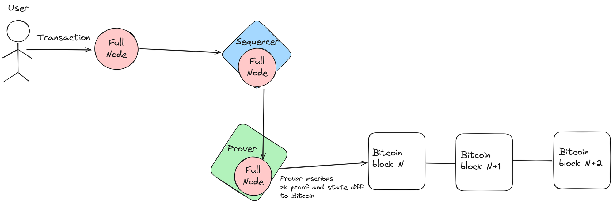 A sequencer is a type of full node that soft-confirms the transactions and builds blocks. It then propagates these soft confirmations, soft blocks, to every full node available. The purpose of soft-confirmations is to provide users with fast transaction experience. The next step involves a special type of full node that is used for zero-knowledge rollups. This full node is called Prover and has an important role in inheriting Bitcoin security for user's transactions.