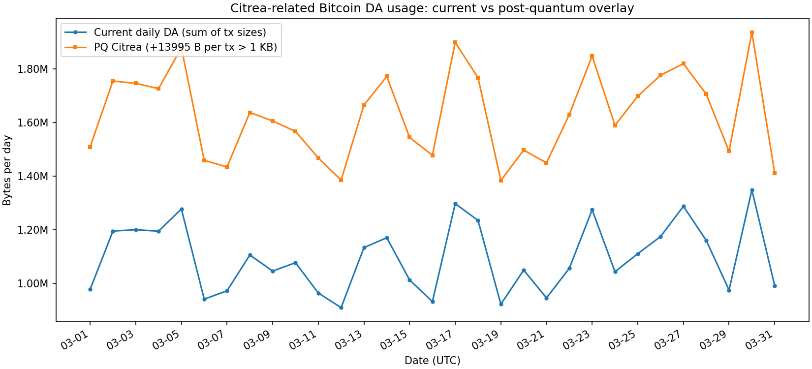 In our current architecture, we wrap these STARKs into SNARKs to minimize the data footprint on Bitcoin. In a post-quantum scenario, we would transition to wrapping them in PQ-friendly SNARKs [4]. Based on our modeling of mainnet data, this transition would result in roughly a 50% increase in the total bytes posted to Bitcoin daily.