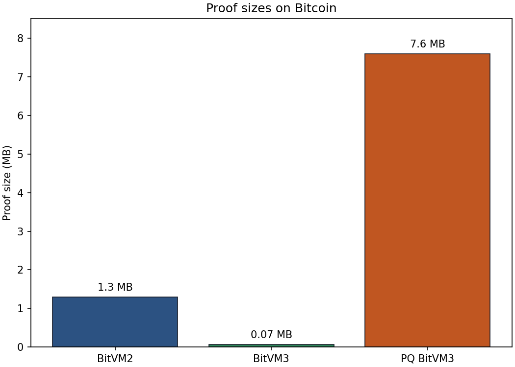 - PQ proof verification in BitVM: For optimistic verification of ZK proofs on Bitcoin, we can construct a garbled circuit that can verify PQ proof statements. Current literature suggests a proof size of ~14 kB at 80 bits of security. In a BitVM3 context, where a Garble Circuit requires signing each proof bit via Lamport Signature, this results in an on-chain proof size of roughly 7.6 MB.