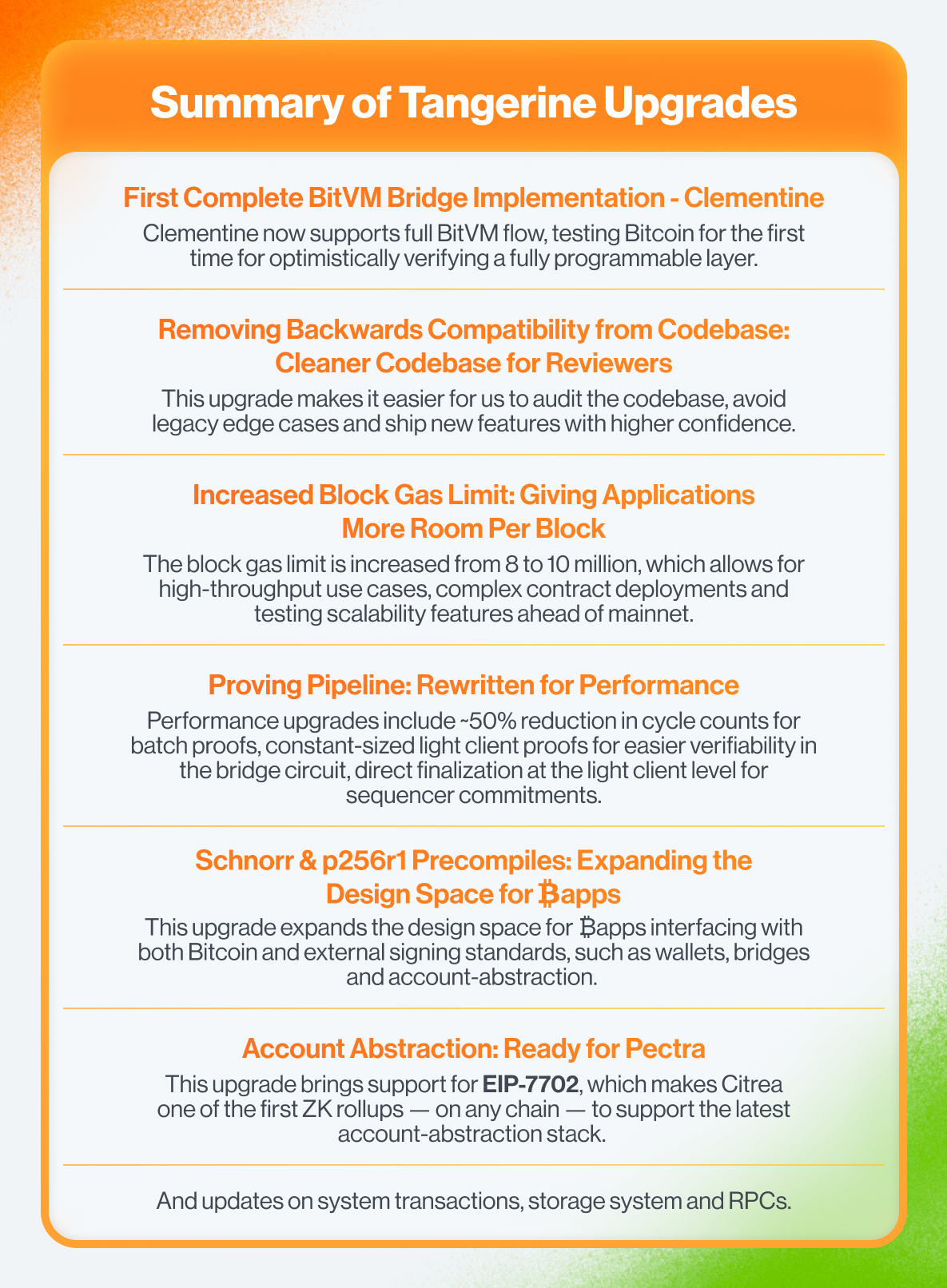 Today, we’re introducing Tangerine, the second ever Citrea testnet fork. This upgrade brings our most significant changes yet — across proving performance, protocol security, account abstraction, and developer tooling. Tangerine represents a feature-complete version of the Citrea’s state-transition-function, meaning future upgrades will likely consist only of bug fixes, code refactors, and improvements. This marks a significant step toward our mainnet launch.